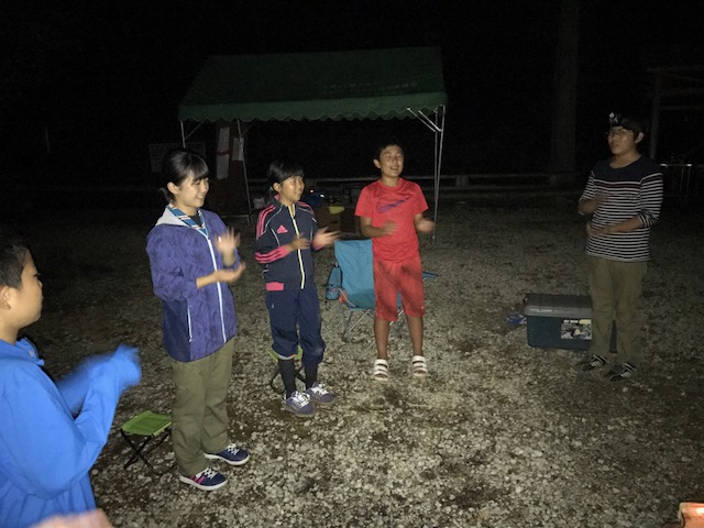 サマーキャンプ2日目は、パイオニアリングやキャンプファイヤーをやりました。パイオニア(開拓する)ということで生活しやすくするために必要な物干し台やマキ置き場などを考えて作りました。キャンプファイヤーでは、各班で練習した出し物を見あったり、一緒になって踊ったりしました。