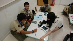 まずは、制作。ボーイ隊は夏のサマーキャンプでの角縛りのスキルが存分に生かされました。ベンチャー隊は、あいかわらずの冒険です。ふっとい竹を力強く縛っていきます。