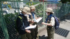 5月5日は全員で隊集会。訓育には絶好の天気。大雨!でも、スカウトたちはみんな元気でした。雨を笑顔で見上げて、電灯の高さを計測。走ったり、手をつないだり、工夫した図り方で50mを計測。気にもしません。元気な声が響きました。とてもたくましい!困難な状況でも上を向き、笑顔で進むスカウトの力強さを感じました。大雨もまた楽しい思い出です。