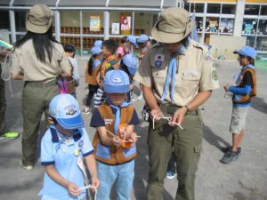 パイオニアリングと夕食の後は、JOTA・JOTIに参加しました。JOTAでは、無線を使って大阪府岸和田のボーイスカウトと交信しました。JOTIでは、スマートフォンやタブレット端末を利用して、ホームページや掲示板、チャットルームへの書き込みをしました。